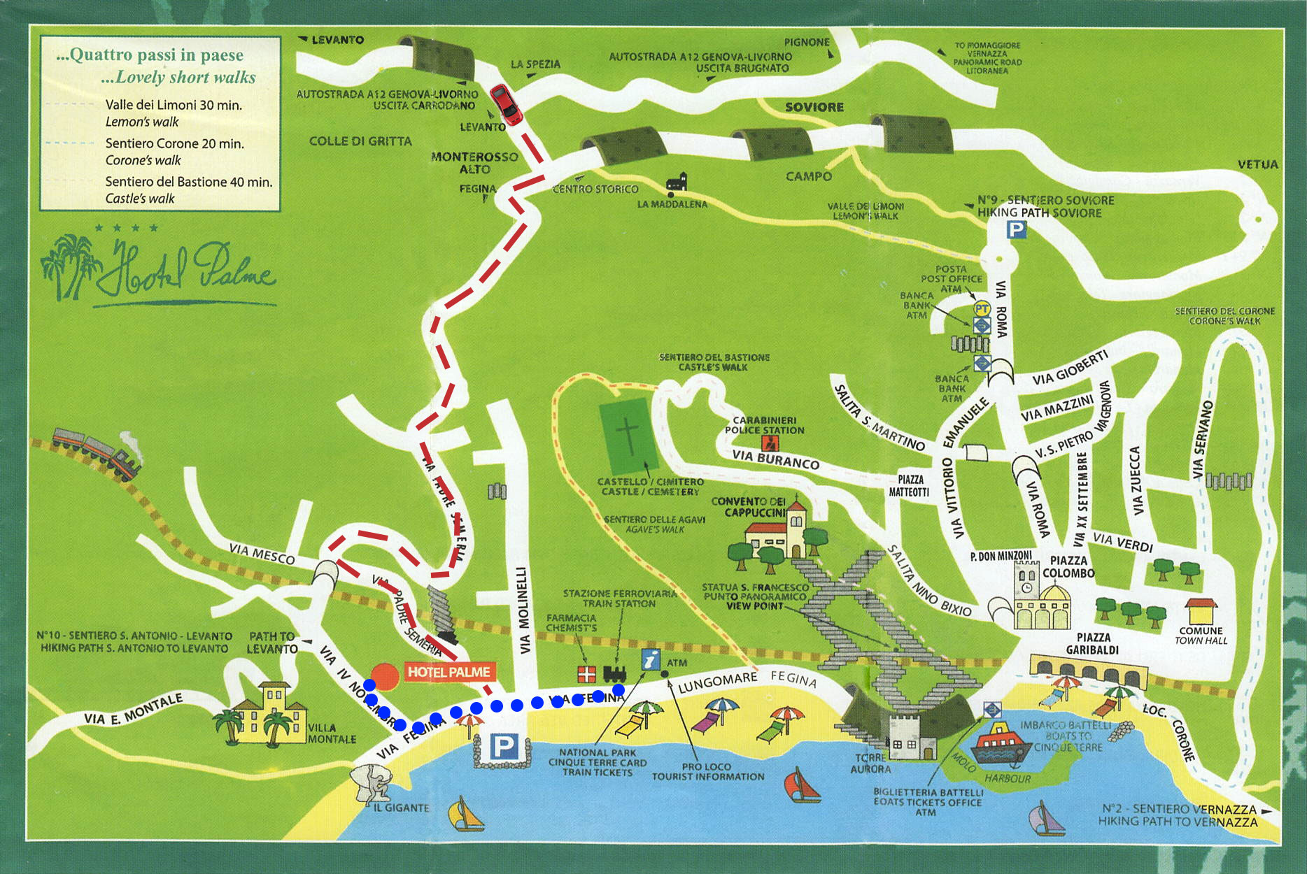 Autostrada A12 Genova/Livorno, uscire al casello di Carrodano, proseguire per Levanto e seguire le indicazioni per Monterosso – Fegina